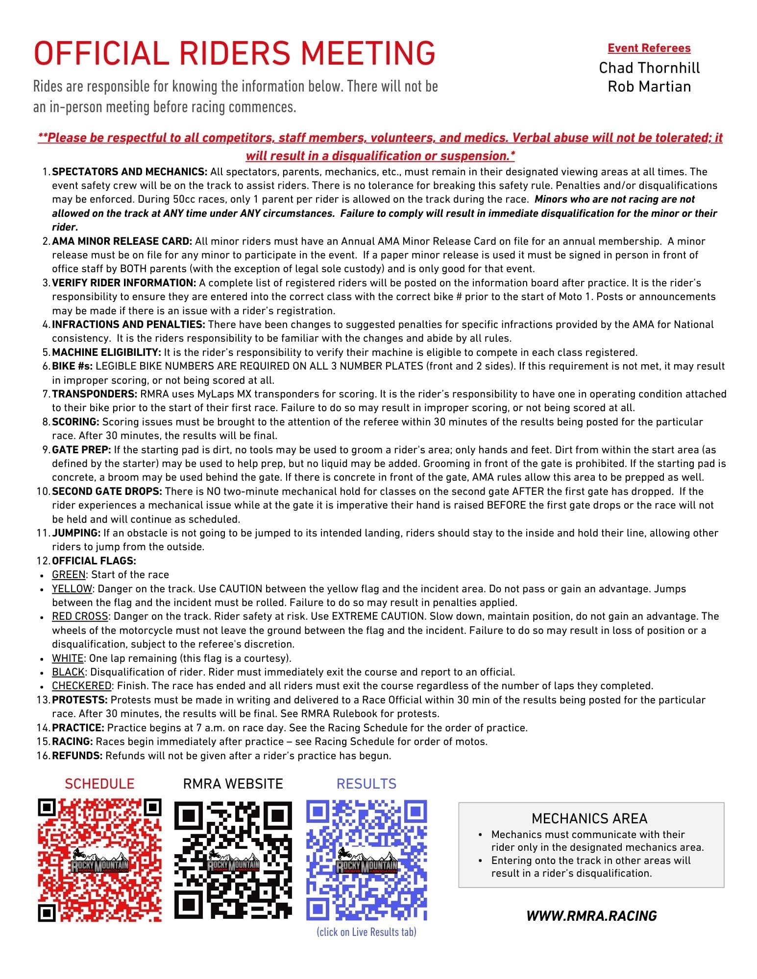The Rocky Mountain Riders Association is an AMA sanctioned organization and all races are AMA sanctioned. Because of this, all members of the RMRA must also be current members of the AMA. If the rider is not a member of the AMA or the membership is expired, they must sign up before racing in an RMRA event. Riders may sign up for an AMA membership at the event, but it may take longer to receive their AMA card.